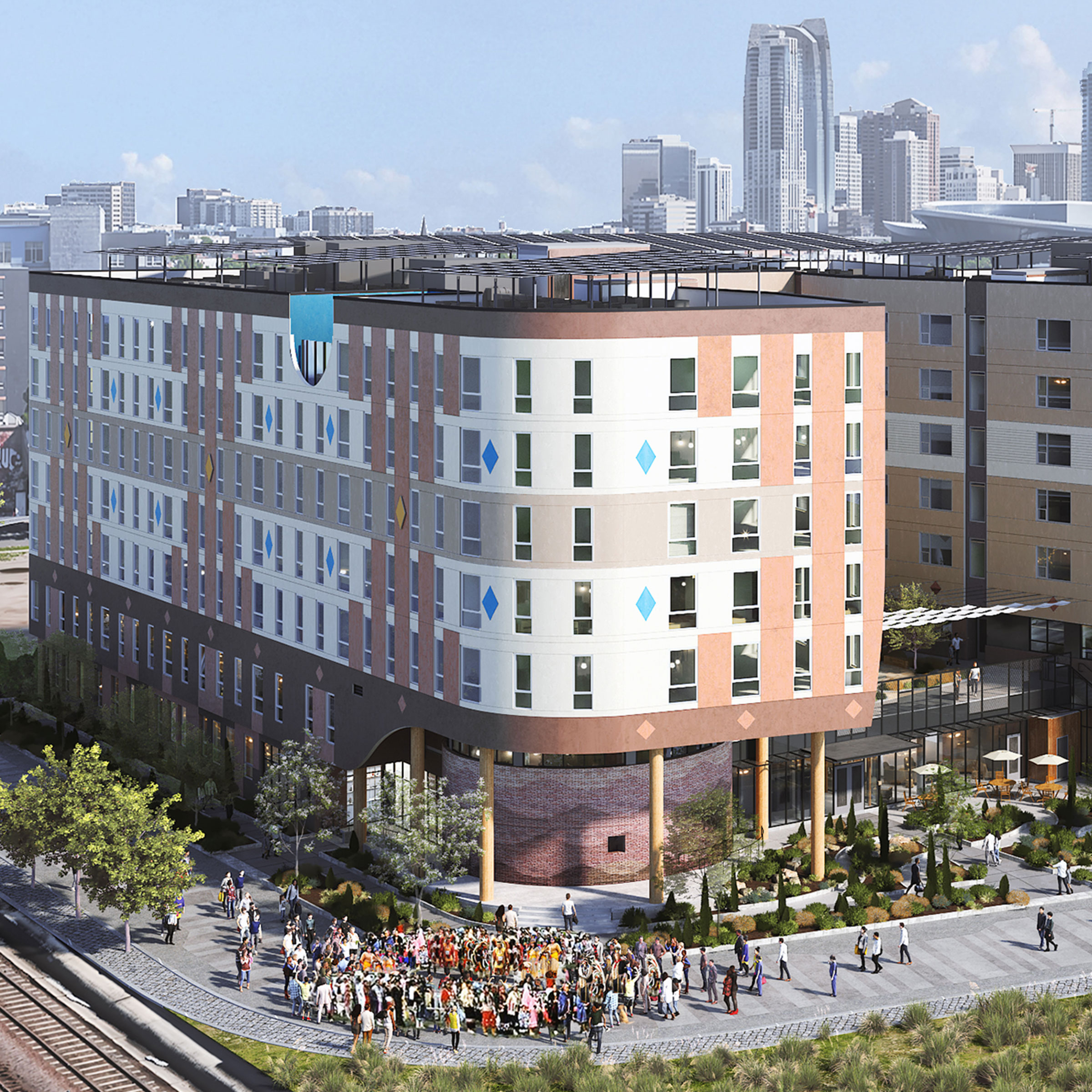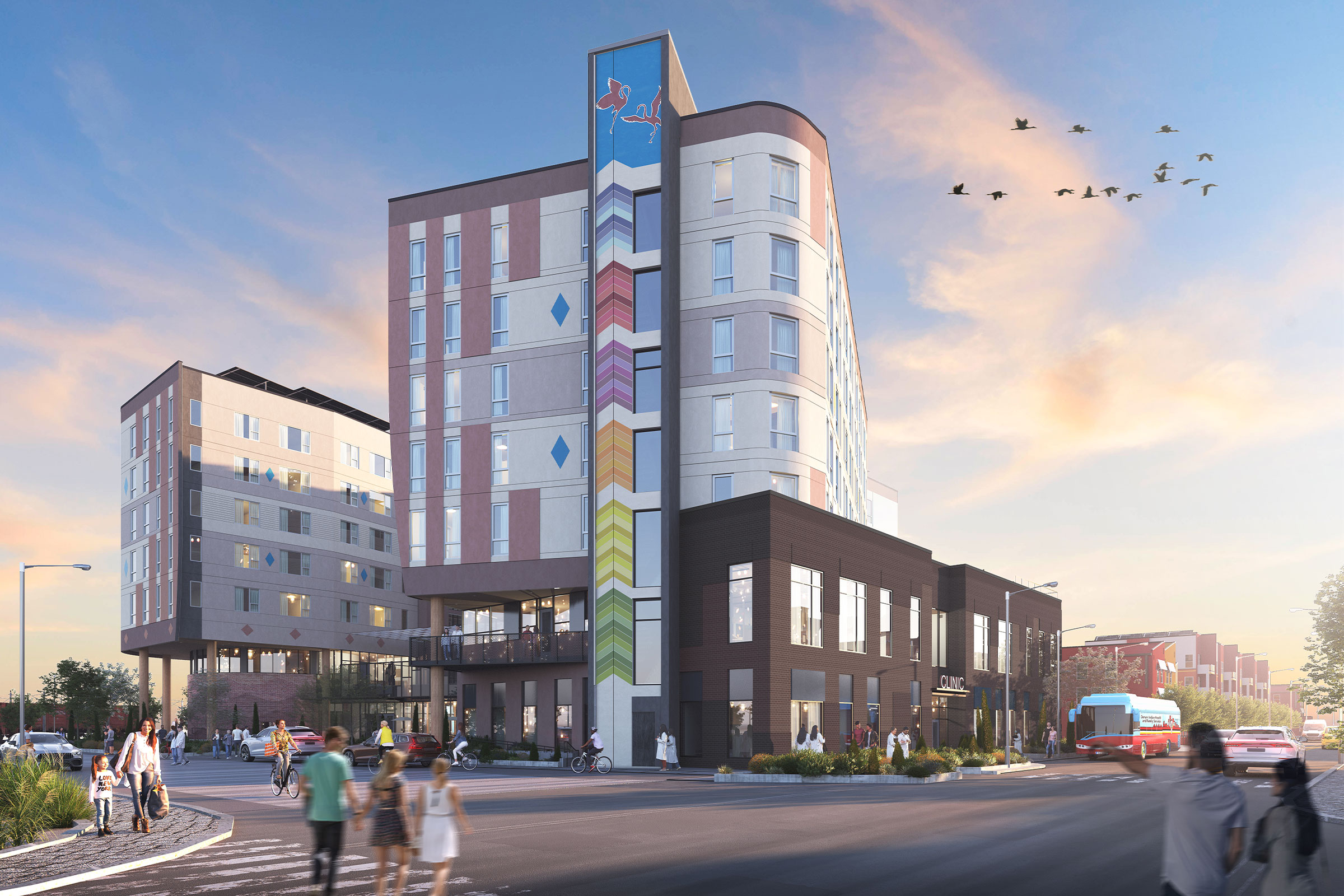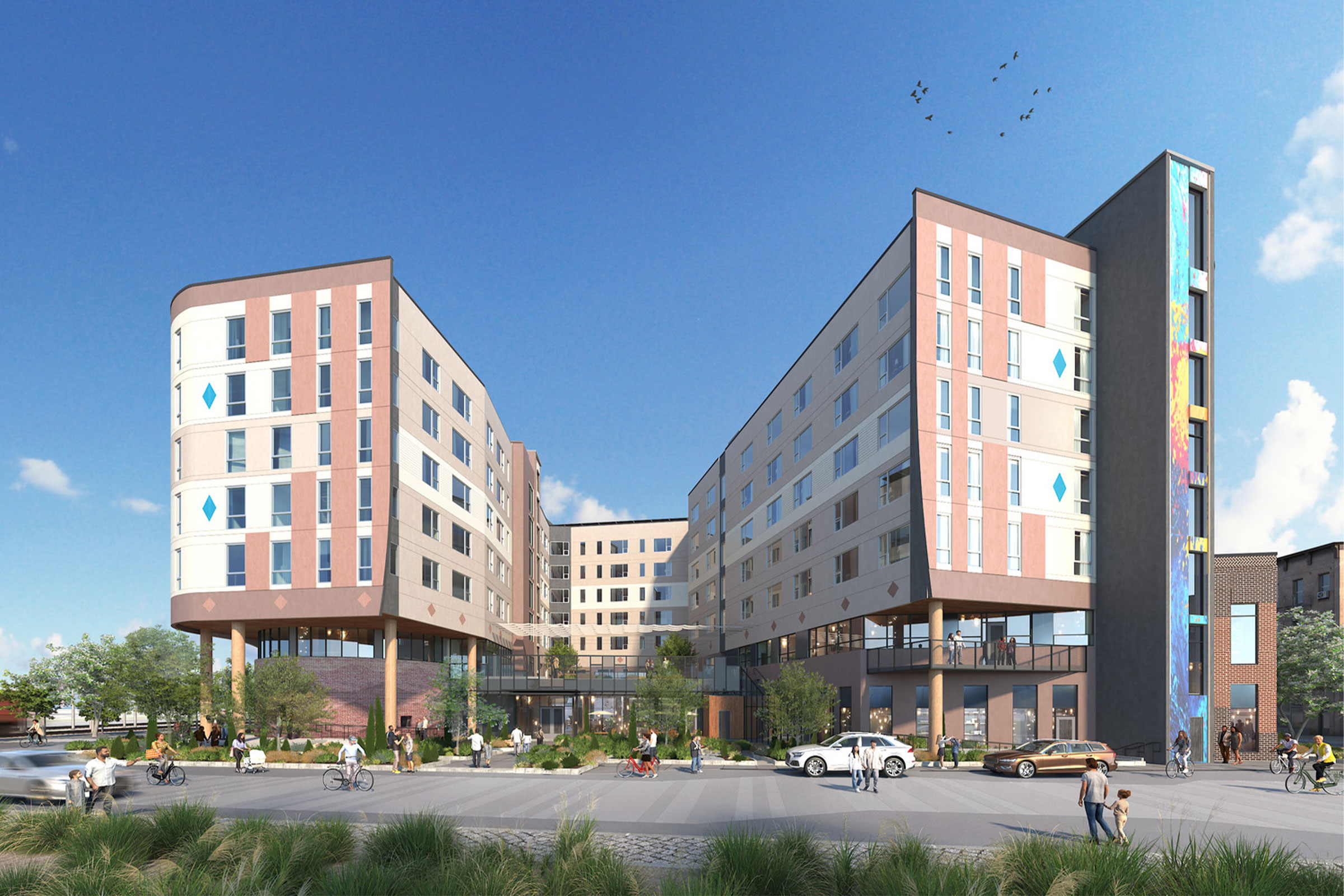 The new mixed-use community will offer approximately 190 rental apartments ranging from one to four bedrooms, 60% of which will be devoted to individuals and families earning 30-60% of the area’s median income, and 40% following a permanent supportive housing model, providing homes for the previously unhoused along with wrap around services.
